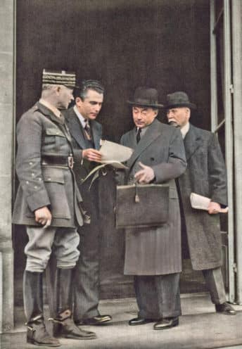 de gauche à droite, Maxime Weygand, Paul Reynaud, et Philippe Pétain en mai 1940. Le 17 mai, Pétain est nommé vice-président du Conseil dans le gouvernement de Paul Reynaud.